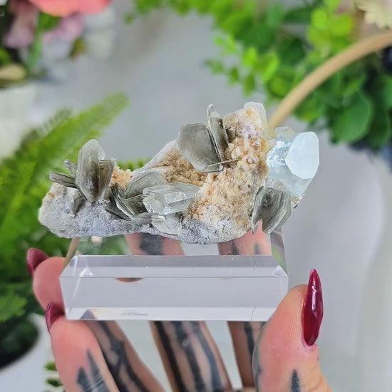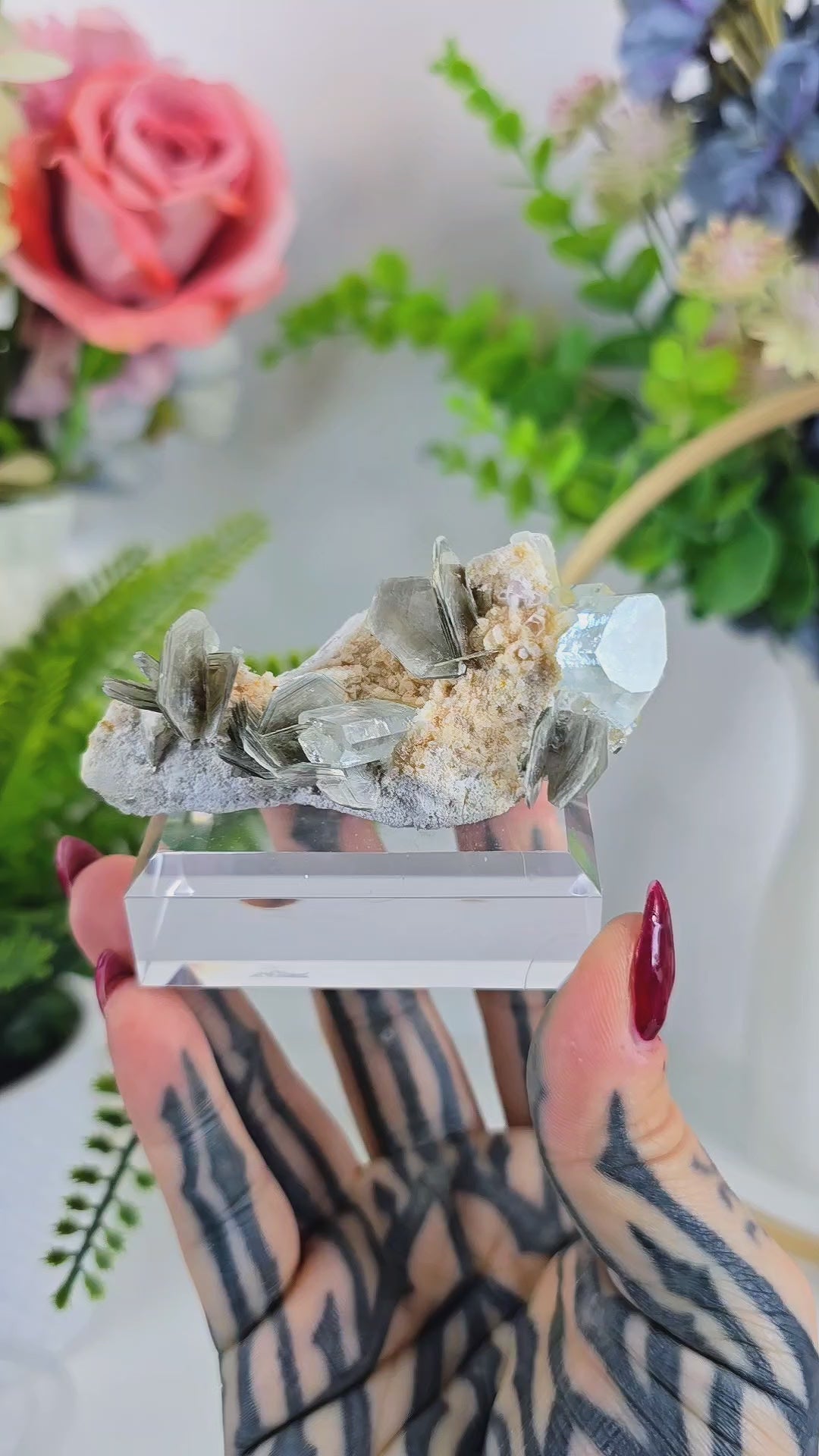 Mounted on a clear acrylic display base, this piece is ready to showcase and ideal for mineral collections, display cabinets, desks, or refined interior décor. The contrast between the transparent blue Aquamarine, silvery Muscovite plates, and pale Albite matrix makes this specimen especially eye-catching and aesthetically balanced.