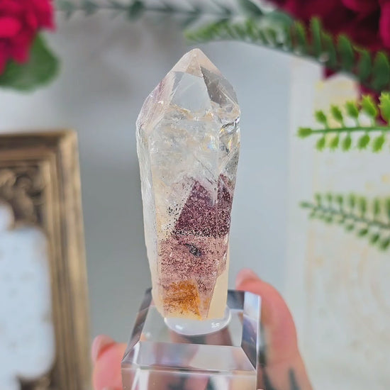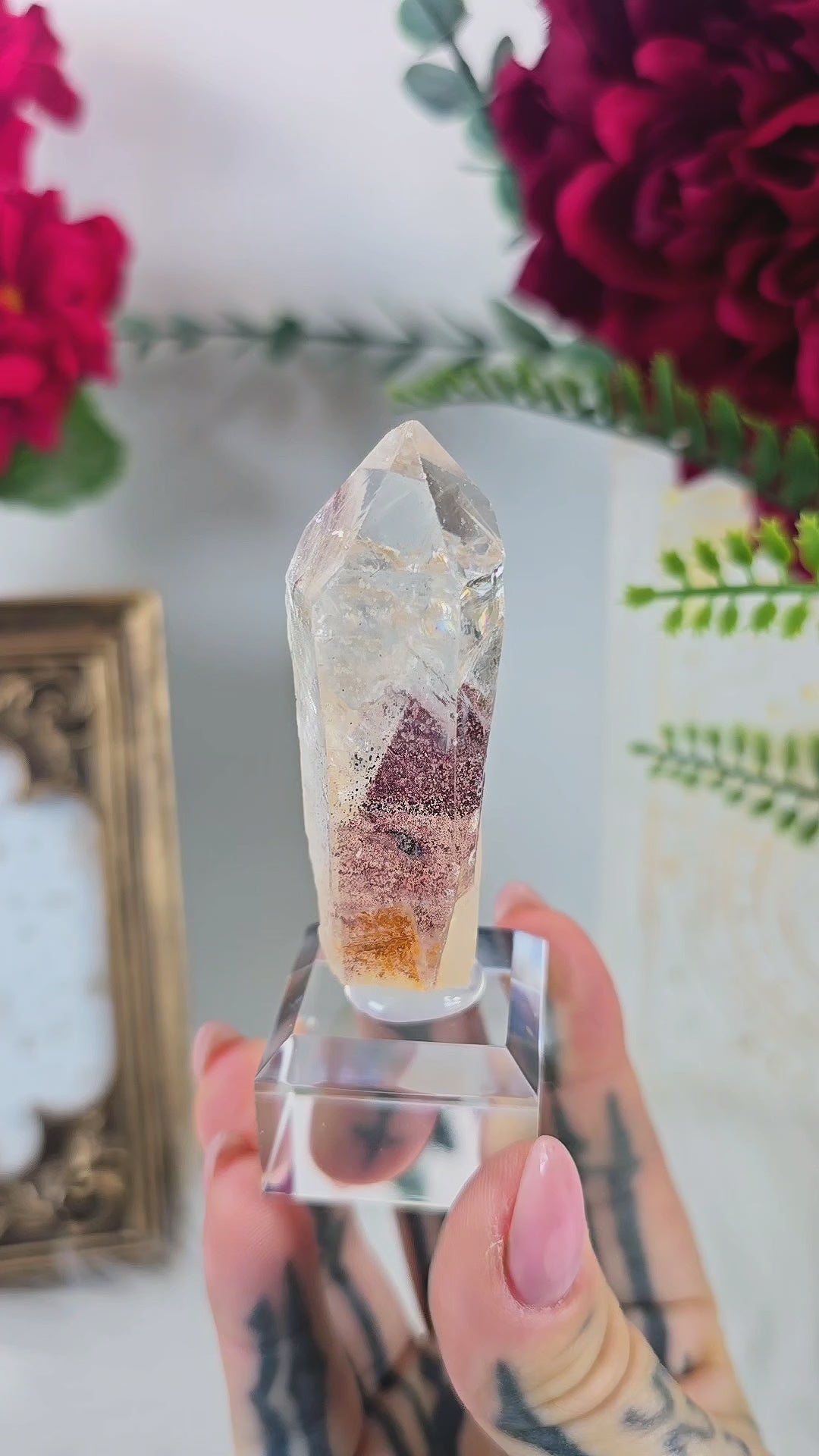 Red Hematite Phantom Point – Quartz + Hematite Specimen on Clear Display Base