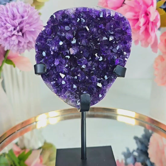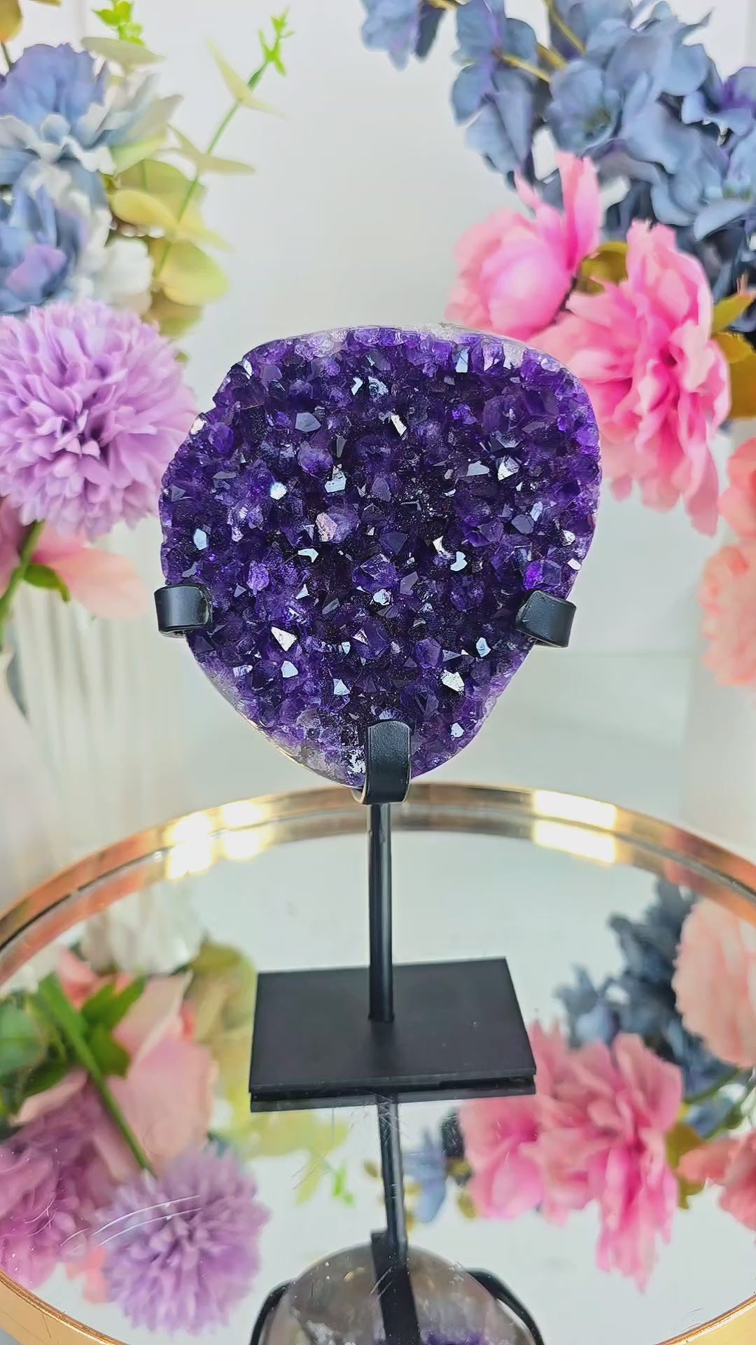 Bring depth, mystery and natural elegance into your space with this striking Dark Druzy Amethyst mounted on a metal stand. Its intense purple hues and shimmering druzy texture make it a captivating décor piece and collector’s gem.