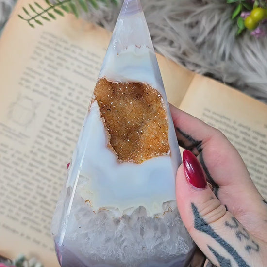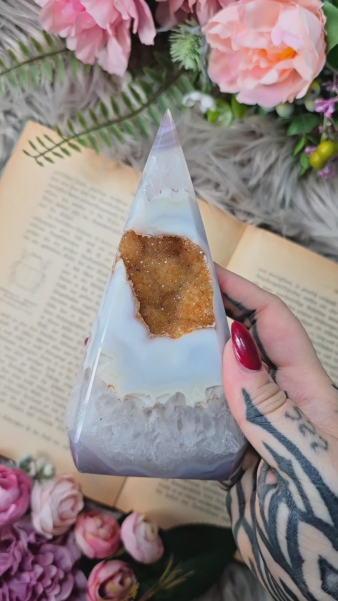 Druzy Agate Flame / Pyramid / Diamond shape on stand D20