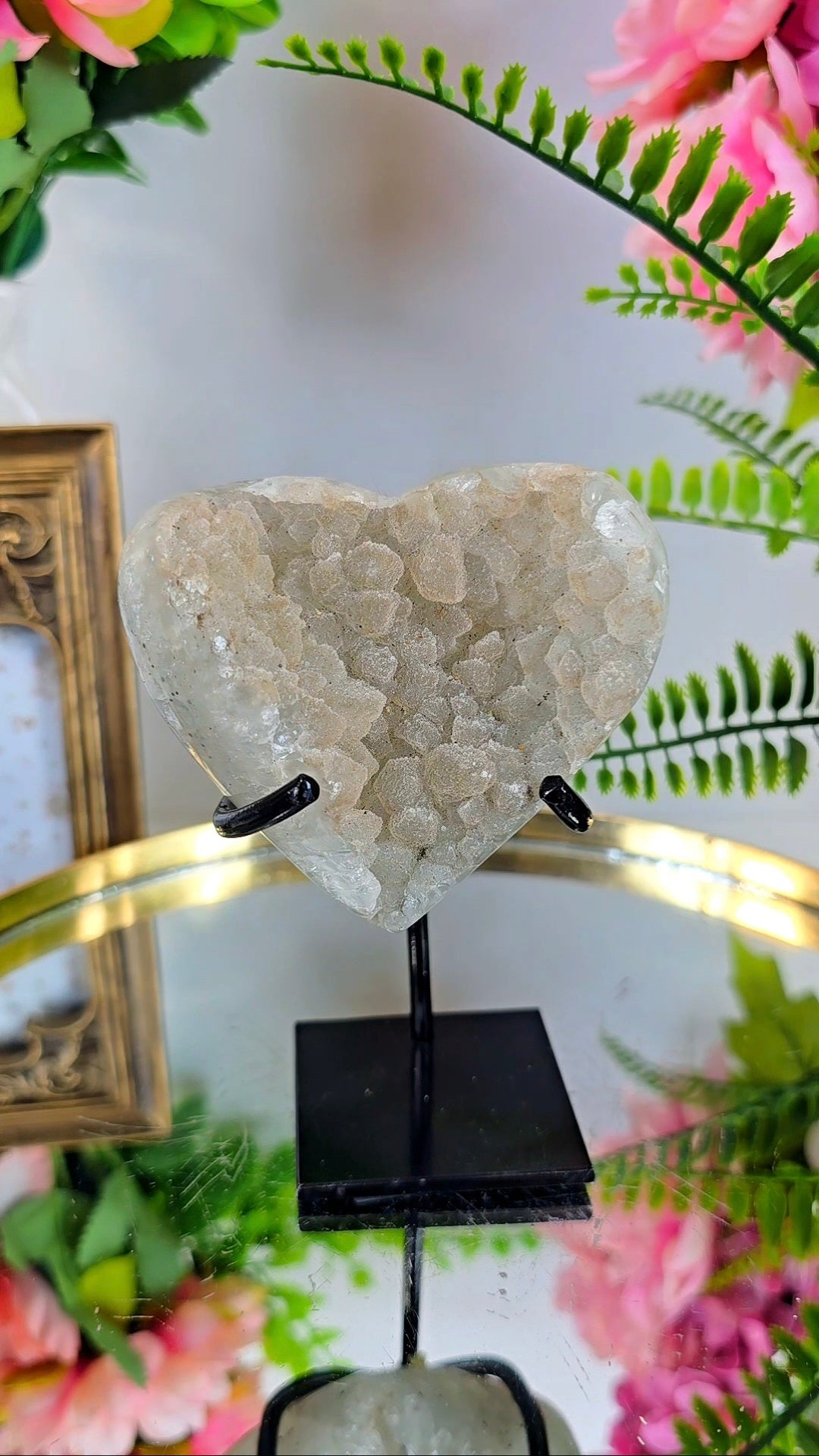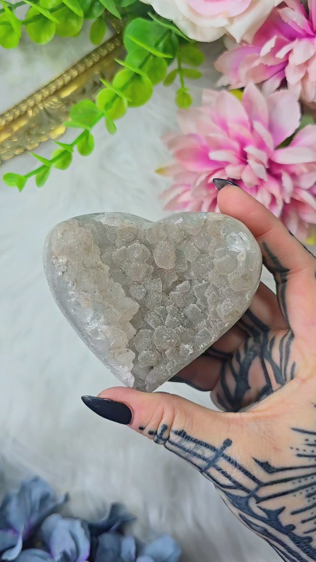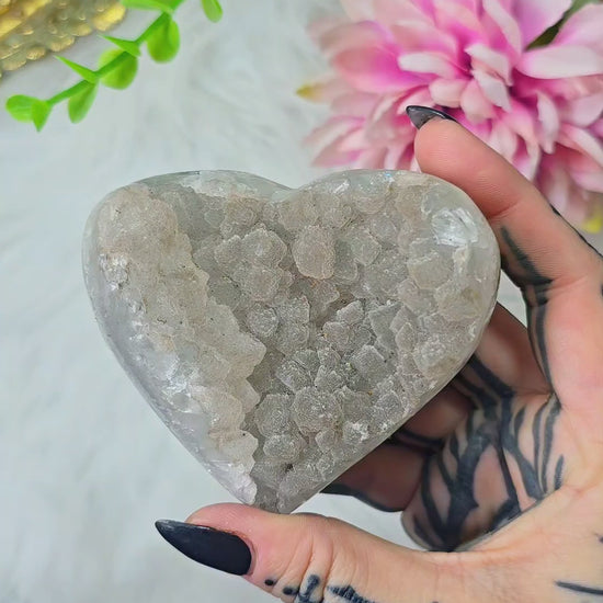 This piece combines the calming beauty of a rainbow amethyst with the charm of a heart shape and the sparkle of a sugary surface. Whether used as a decorative accent, a collector’s specimen, or a meaningful gift, it brings a soft, elegant presence to any room.