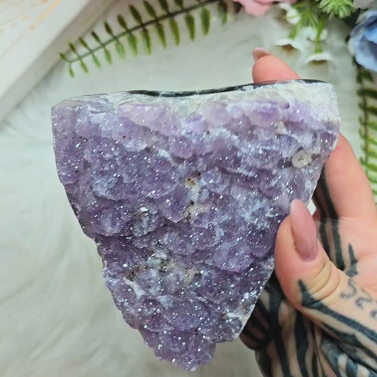 Elevate your home décor with a one-of-a-kind natural treasure: this Rainbow Amethyst piece from Uruguay — elegantly mounted on a stand — blends raw geological beauty with refined presentation. Perfect for collectors, interior lovers, and crystal enthusiasts alike.