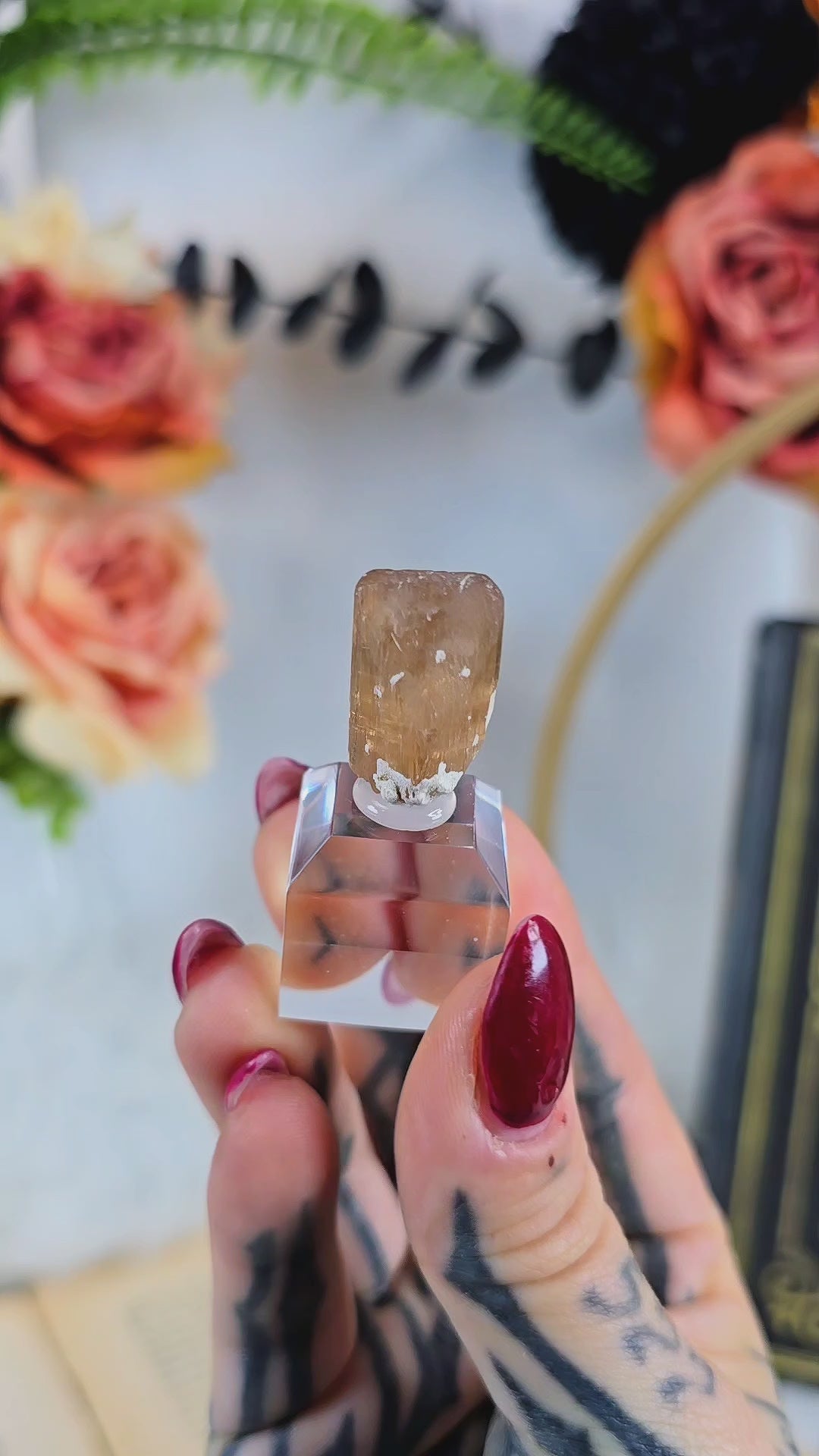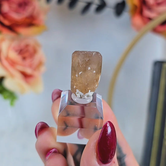 This elegant natural Topaz specimen features a well-formed crystal from the Skardu region of Pakistan, professionally mounted on a clear display base for effortless presentation. Topaz is a highly collectible silicate mineral, admired for its vitreous luster, prismatic crystal habit, and impressive durability.